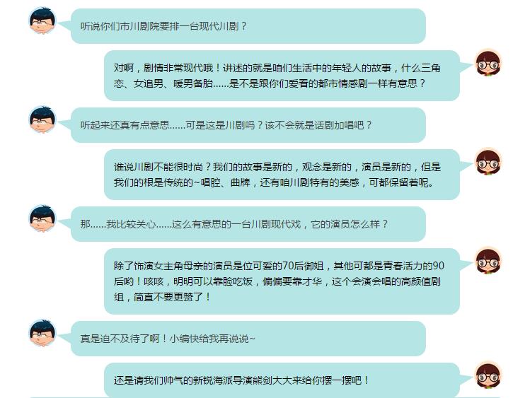 戏曲现代戏多为近代和农村题材,而川剧表现与时代同步、表现当下生活的现代戏更是微乎其微。简单用一句“话剧加唱”来评价现代戏的确有失公允,我认为当年的样板戏就是“话剧加唱”。如果能认真地向川剧艺术的美学思想学习,同时能够有深入生活、表现生活的创作精神,把话剧艺术中关于人物内部心理动作及情感体验技巧与川剧艺术鲜明、独特的表演形式有机地结合起来,即使就是“话剧加唱”又未尝不可,这样的话,就不是仅仅演情节故事,更重要的是人物内在准确、细腻、生动的心理活动和情感表现,是人物心与心的交流和碰撞。