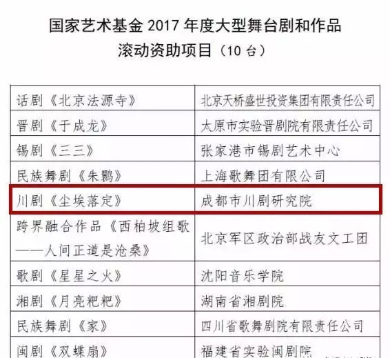 川剧《尘埃落定》继入选国家艺术基金2015年度舞台艺术创作资助项目后,又入选国家艺术基金2017年度大型舞台剧和作品滚动资助项目。被国家艺术基金两次资助,实属不易,是对该剧的充分肯定和赞扬,标志着地方剧种川剧从此正式进入国家顶级剧种扶持行列。