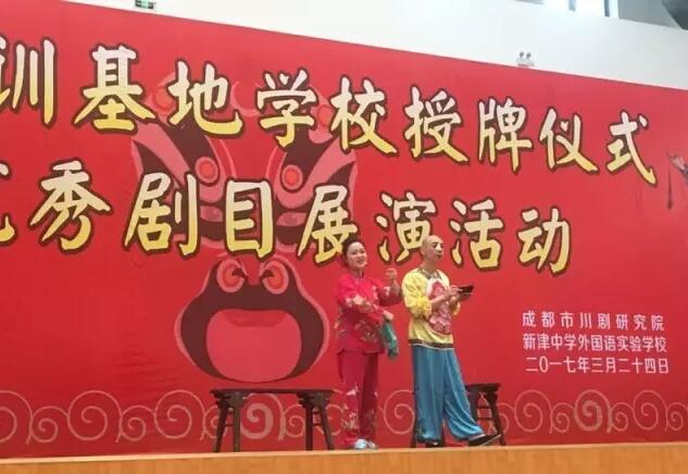 3月24日下午,“川剧培训基地学校授牌仪式暨优秀剧目展演活动”在新津中学外国语实验学校隆重举行。新津县教育局吴志良副局长和我院雷音院长分别致辞,随后中共成都市委宣传部文艺处李金亮副处长为新津中学外国语实验学校授牌“川剧培训基地学校”,新津中学外国语实验学校何飞校长接牌。成都市教育局体卫艺处、成都市文广新局艺术处、新津县教育研究培训中心以及成都日报、新津电视台等媒体出席授牌仪式。仪式结束后,我院国家二级演员叶长敏、虞佳、姚建,优秀青年演员刘茜、李玉、刘磊和演奏员陈珺瑶等先后表演了川剧折子戏《人间好》《滚灯》,京胡独奏《夜深沉》,川剧绝技《变脸吐火》和川剧戏歌《春夜喜雨》等优秀节目,受到学生们的热烈欢迎。